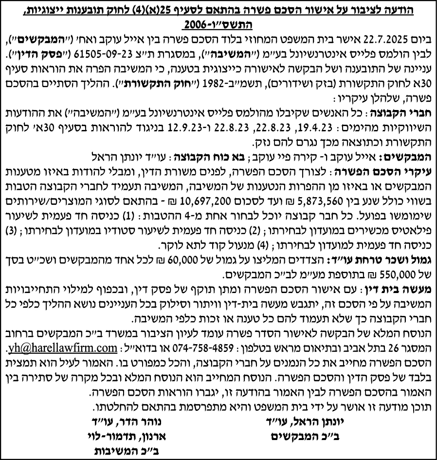 תקציר – ביום 22.7.2025 בית המשפט המחוזי בלוד אישר בקשה להסדר פשרה בין אייל עוקב ואח' לבין הולמס פלייס אינטרנשיונל בע״מ