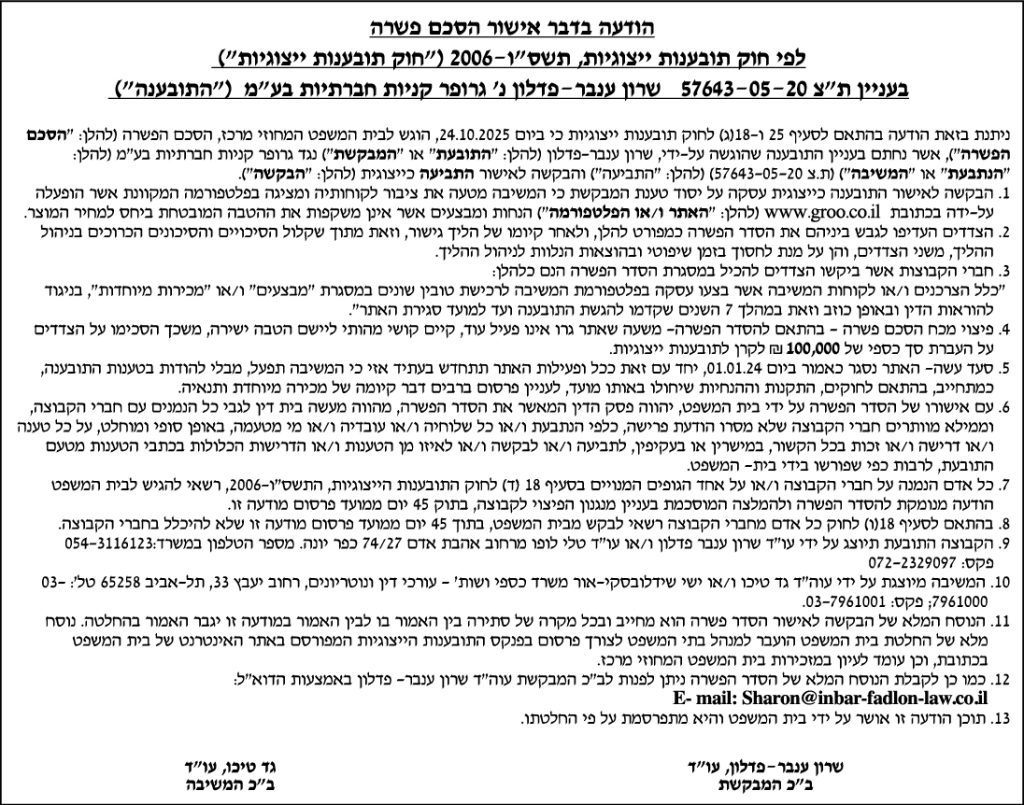 תקציר – ביום 24.10.2025, בית משפט המחוזי מרכז אישר בקשה להסדר פשרה בין שרון ענבר-פדלון לבין גרופר קניות חברתיות בע״מ