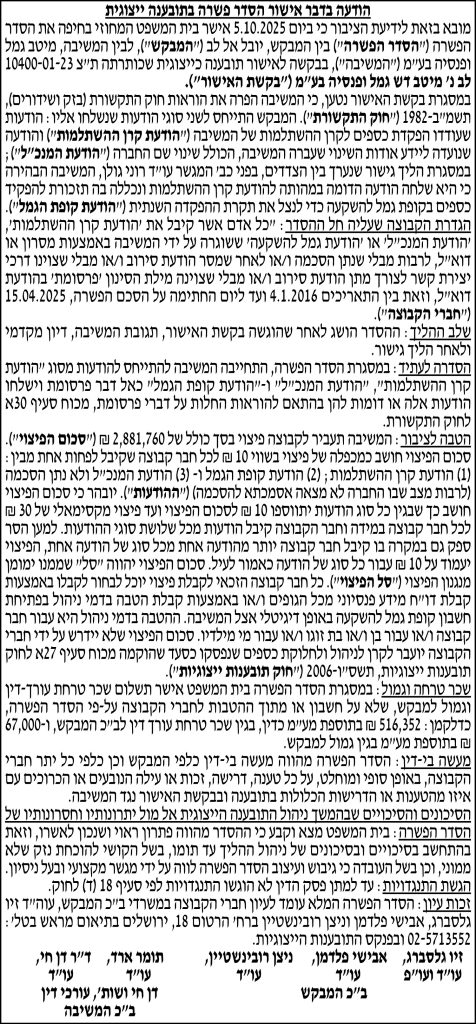 תקציר – ביום 5.10.2025 5.10.2025 אישר בית המשפט המחוזי בחיפה את הסדר הפשרה הפשרה בין יובל אל לב לבין המשיבה, מיטב גמל
