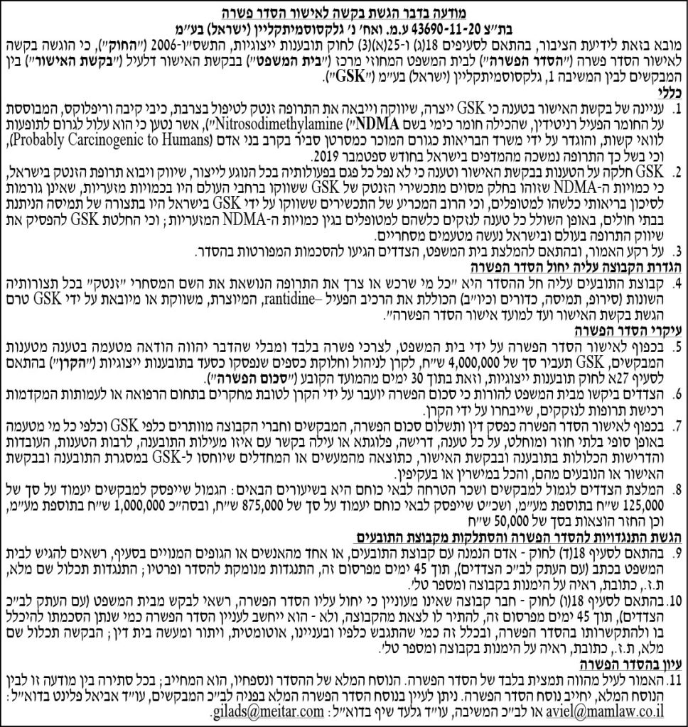 תקציר – הוגשה לבית המשפט המחוזי מרכז בקשה לאישור הסכם פשרה בין ע.מ ואח' לבין גלקסוסמיתקליין