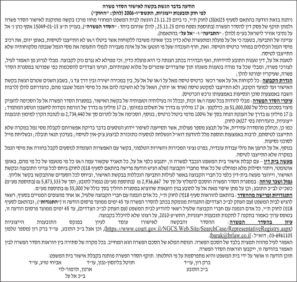 תקציר – ביום 23.11.25 הוגשה לבית המשפט המחוזי מחוז מרכז בקשה להסדר פשרה