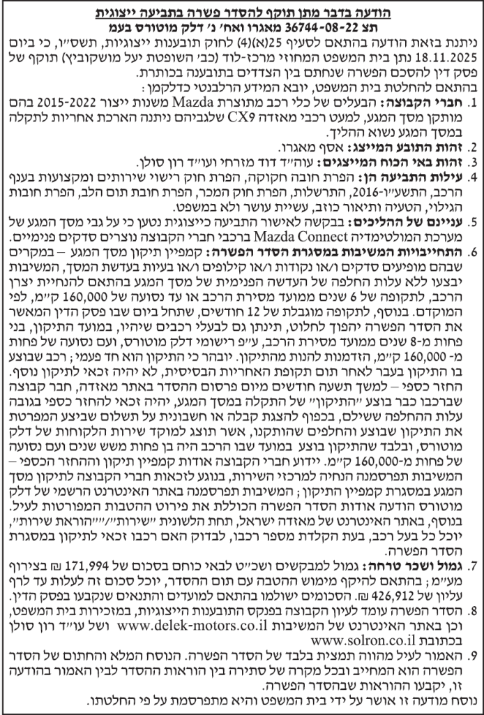 תקציר – ביום 18.11.25 בית הדין המחוזי בלוד אישר בקשה להסדר פשרה בין מאגרו ואח' נ׳ דלק מוטורס בע"מ