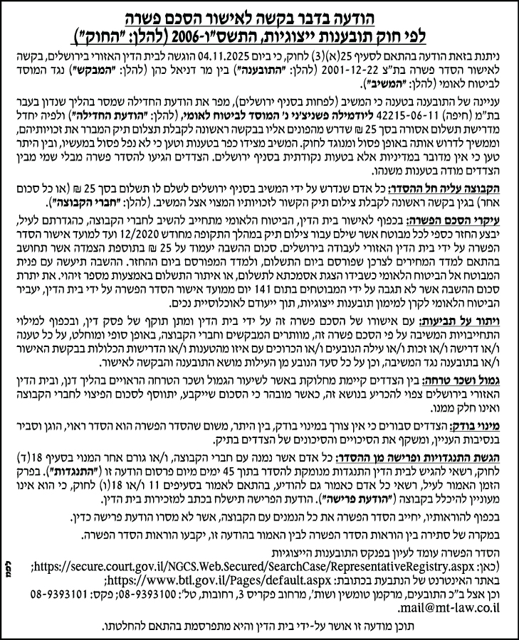 תקציר – כי ביום 04.11.2025 הוגשה לבית הדין האזורי בירושלים, בקשה לאישור הסדר פשרה בין מר דניאל כהן לבין המוסד לביטוח לאומי
