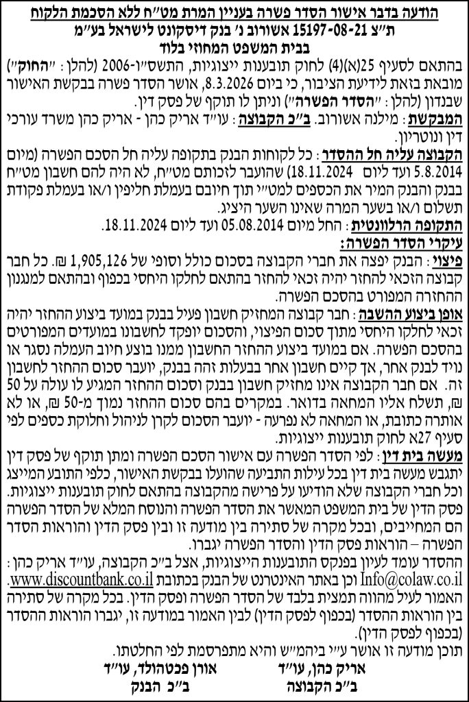 תקציר – כי ביום 8.3.2026, אושר הסדר פשרה בין אשורוב נ׳ בנק דיסקונט לישראל בע״מ
