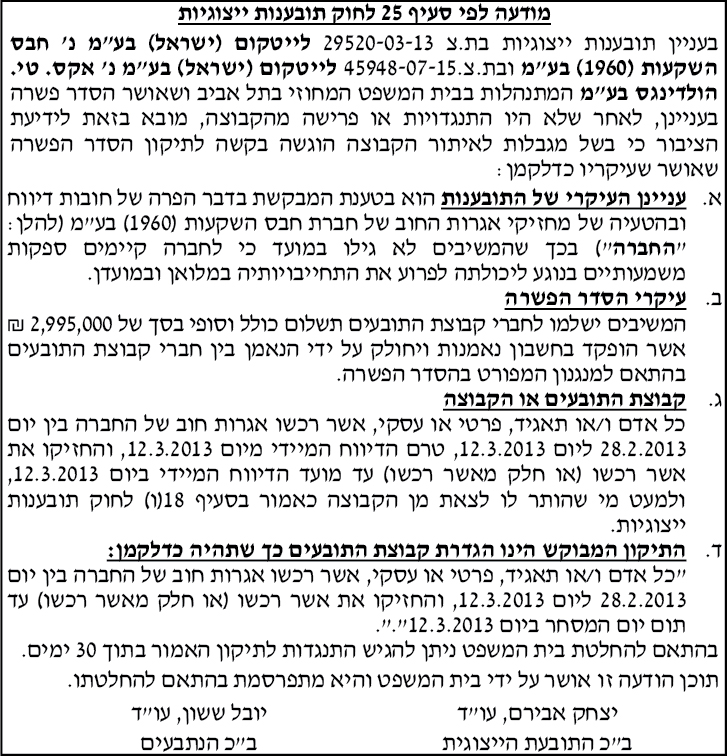 תקציר – בת.צ 29520-03-13 45948-07-15 המתנהלות בבית המשפט המחוזי בתל אביב ושאושר הסדר פשרה בעניינן, לאחר שלא היו התנגדויות או פרישה מהקבוצה, מובא בזאת לידיעת