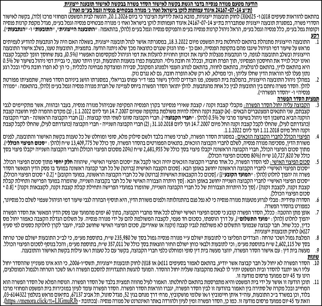 הסדרי פשרה, במסגרת תובענה ייצוגית בין איגוד העמותות לזקן בישראל ואח׳ לבין מנורה מבטחים פנסיה וגמל בע״מ, מגדל מקפת קרנות פנסיה וקופות גמל בע״מ, כלל פנסיה וגמל בע״מ, הראל ניהול קרנות פנסיה בע״מ והפניקס פנסיה וגמל בע״מ
