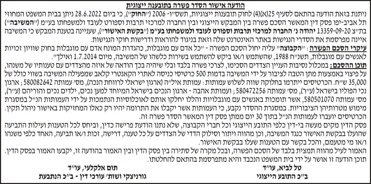 תקציר – ב-28.6.2022 אישר בית המשפט המחוזי תל אביב-יפו ונתן תוקף של פסק דין להסכם פשרה שנחתם בין יהודה לבין החברה למרכזי תרבות וספורט לעובד ולמשפחתו בע"מ