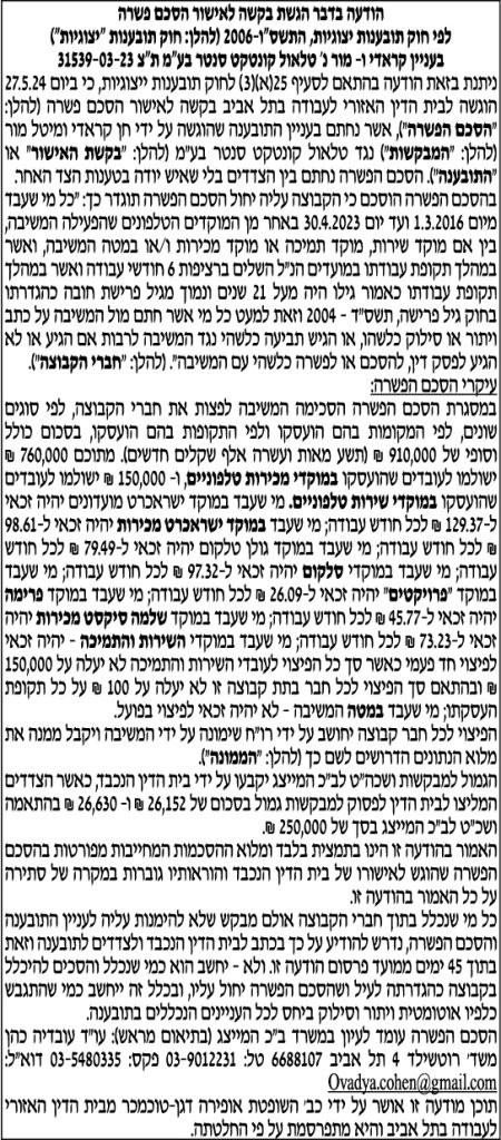 תקציר – ביום- 27.05.2024 בבית הדין האזורי לעבודה בתל אביב אישור הסדר פשרה בין מור לבין טלאול קונטקט סנטר בע"מ