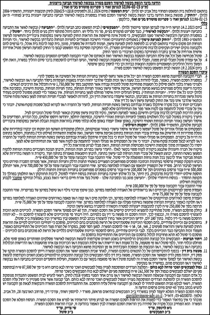תקציר – ביום- 20.02.2024 בבית המשפט המחוזי תל אביב-יפו אישור הסדר פשרה בין לנגרמן לבין ספרינט מוטורס בע"מ ואח'