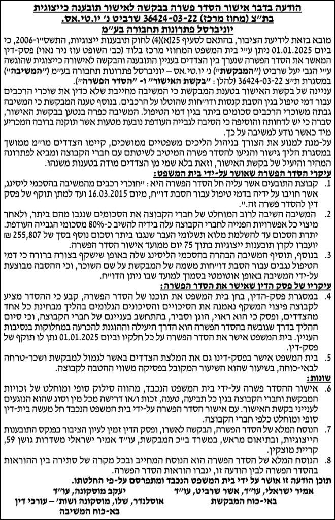 תקציר – ביום- 01.01.2025 בבית המשפט המחוזי מרכז בלוד אישור הסדר פשרה בין הגב' יעל שרביט לבין יו.טי.אס – יוניברסל פתרונות תחבורה בע"מ