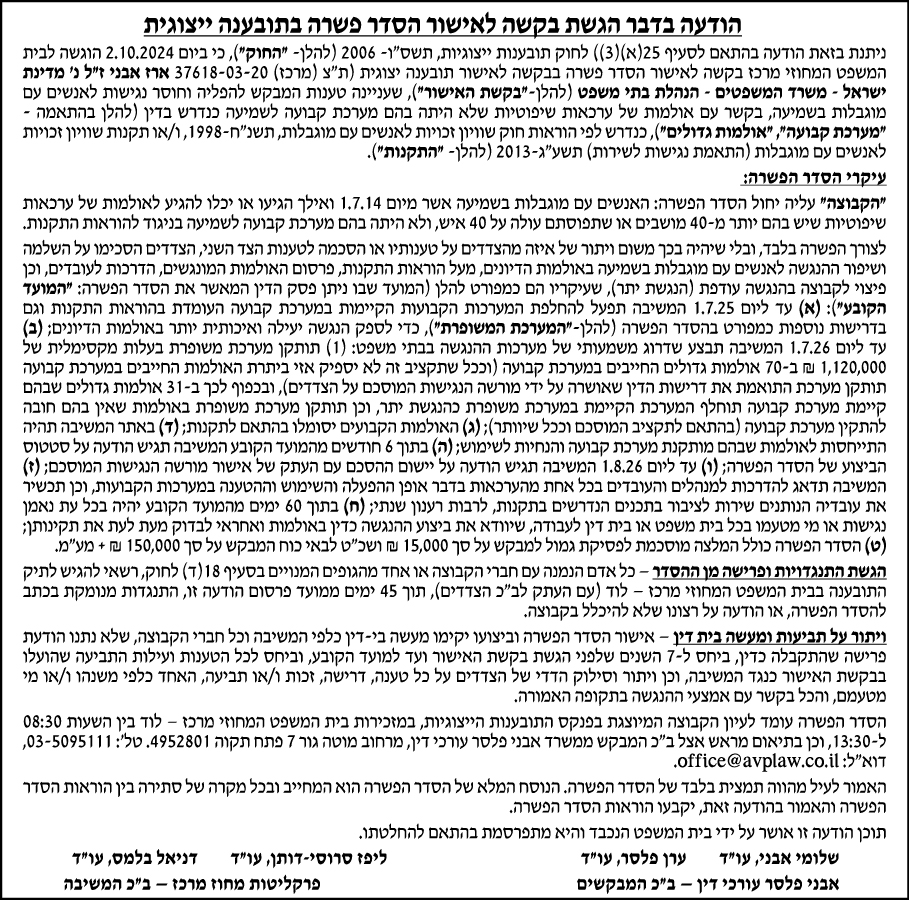 תקציר – ביום- 02.10.2024 בבית המשפט המחוזי מרכז אישור הסדר פשרה בין ארז אבני ז"ל לבין מדינת ישראל – משרד המשפטים – הנהלת בתי משפט