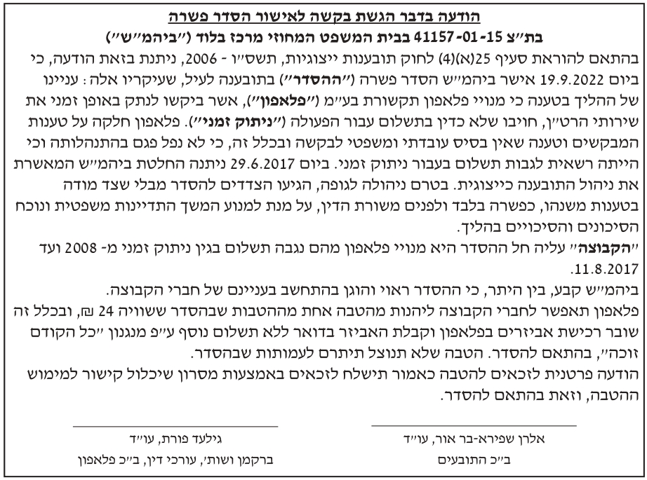 תקציר – ב-19.9.2022 בית המשפט נתן תוקף של פסק דין להסכם פשרה שגובש בין המבקשים לבין פלאפון תקשורת בע"מ