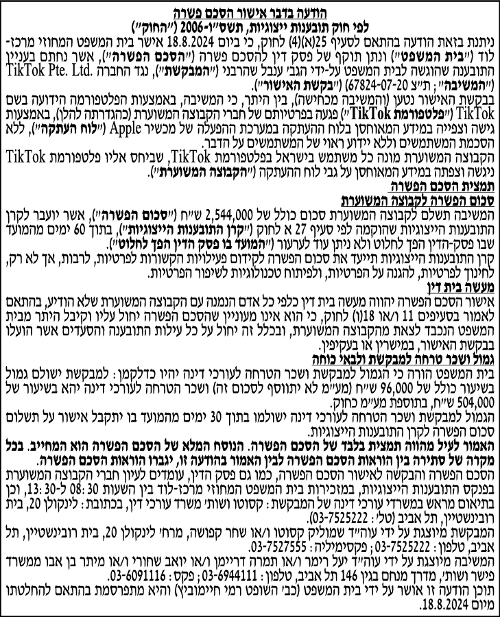 תקציר – ביום- 18.08.2024 בבית המשפט המחוזי מרכז בלוד אישור הסדר פשרה בין הגב' ענבל שהרבני לבין TIK TOK Ltd