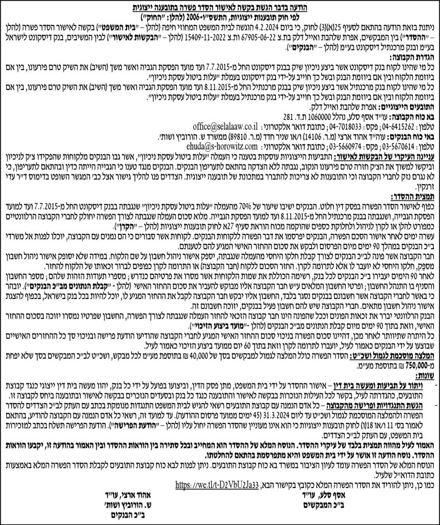 תקציר – ביום- 04.02.2024 בבית המשפט המחוזי חיפה אישור הסדר פשרה בין אפרת שלהבת ואייל דלק לבין בנק דיסקונט לישראל בע"מ ובנק מרכנתיל דיסקונט בע"מ
