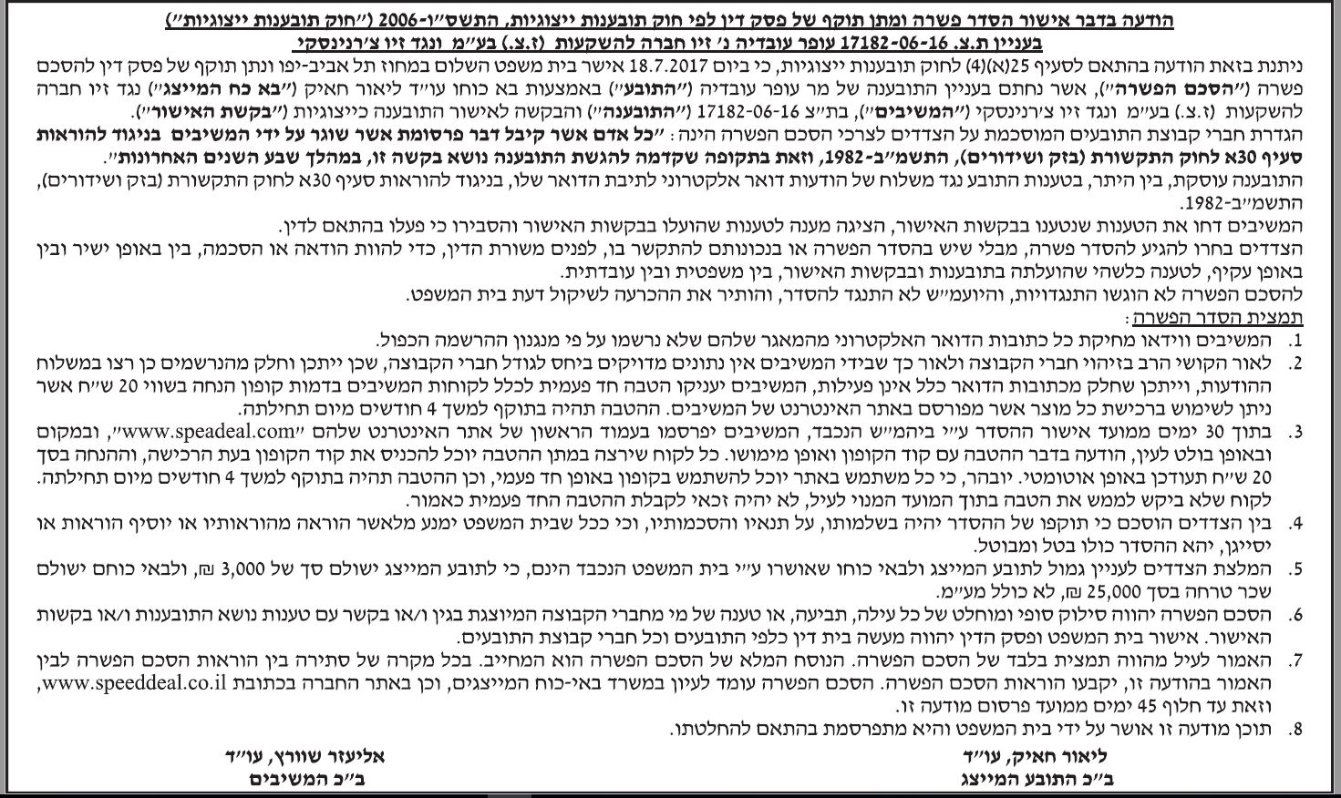 ת"צ: 17182-06-16 הצדדים: עופר עובדיה נ' זיו חברה להשקעות (ז.צ.) בע"מ ונגד זיו צ'רנינסקי תאריך פרסום: 10/8/17