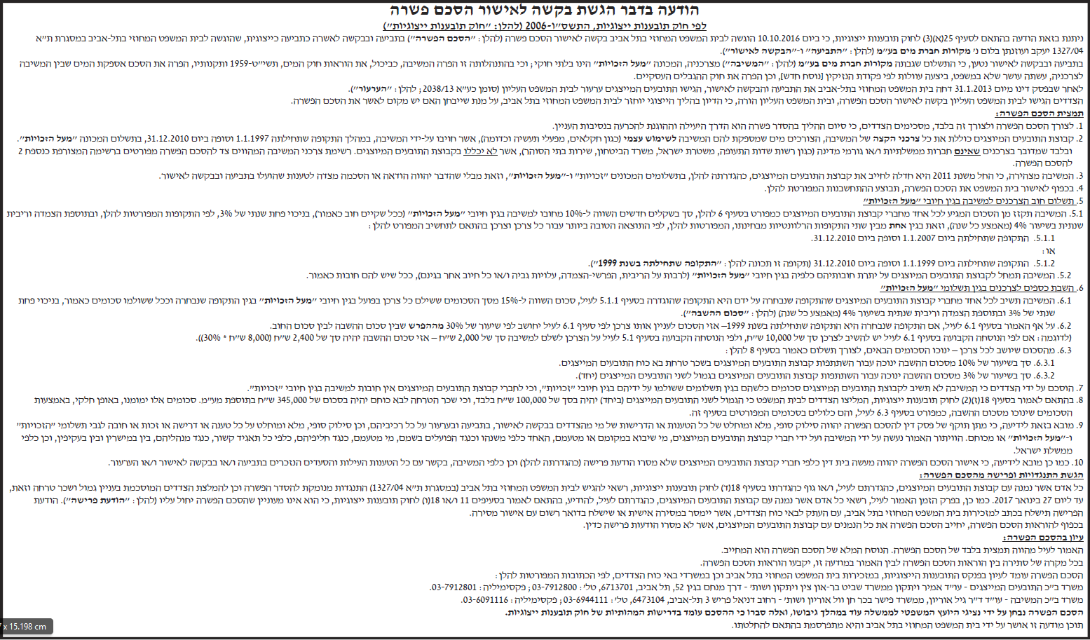 הסכם פשרה | חברת מקורות [13/12/16]