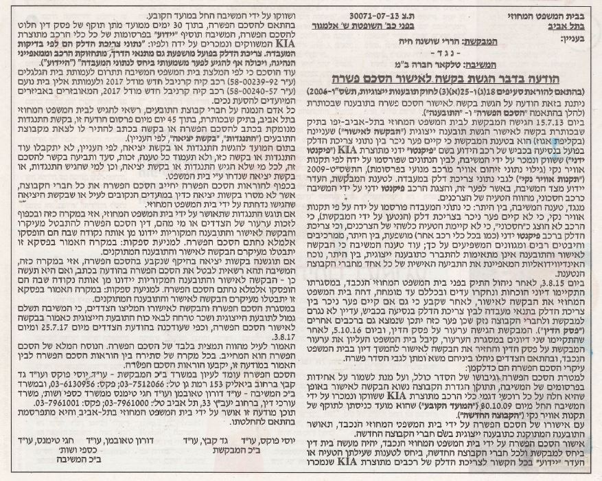 הסכם פשרה | טלקאר חברה ב"מ [6/09/2017]