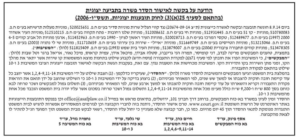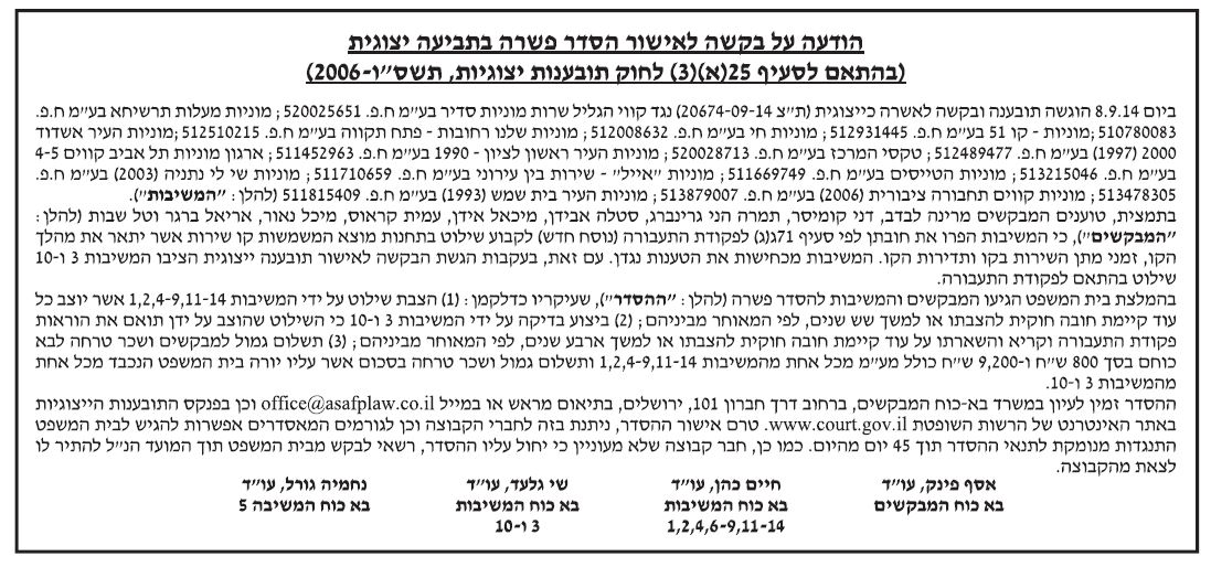 הצדדים: מרינה לבדב, דני קומיסר, תמרה הני גרינברג, סטלה אבידן, מיכאל אידן, עמית קראוס, מיכל נאור, אריאל ברגר וטל שבות נ' קווי הגליל שרות מוניות סדיר בע"מ ח.פ 520025651