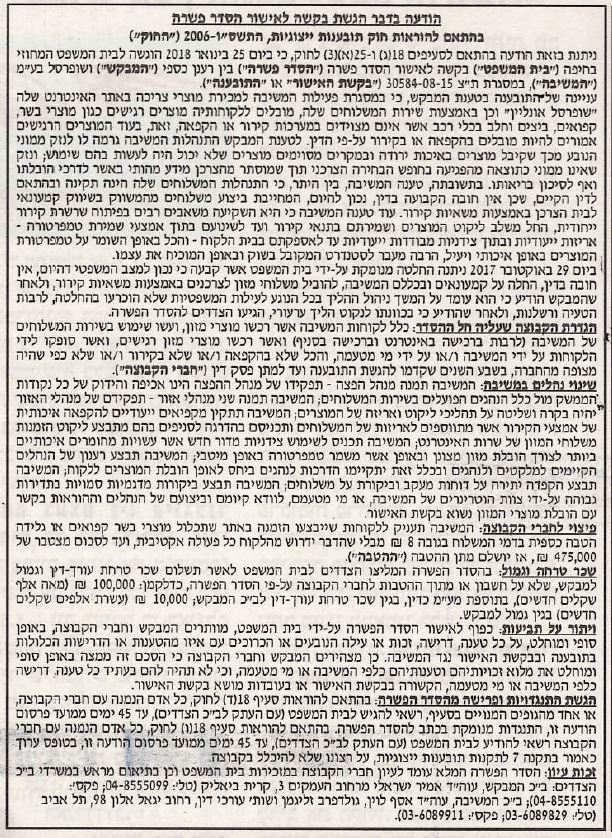 פיצוי: המשיבה תעניק ללקוחות שייבצעו הזמנה באתר שתכלול מוצרי בשר קפואים או גלידה הטבה כספית בדמי המשלוח בגובה 8 ש"ח מבלי שהדבר ידרוש מהלקוח כל פעולה אקטיבית, ועד לסכום מצטבר של 475,000 ש"ח אז יושלם מתן ההטבה.