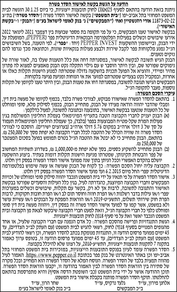 תקציר – ביום- 30.1.25 בבית המשפט המחוזי בתל אביב-יפו אישור הסדר פשרה בין גאורי רוזנשטיין ואח' לבין בנק לאומי לישראל בע"מ