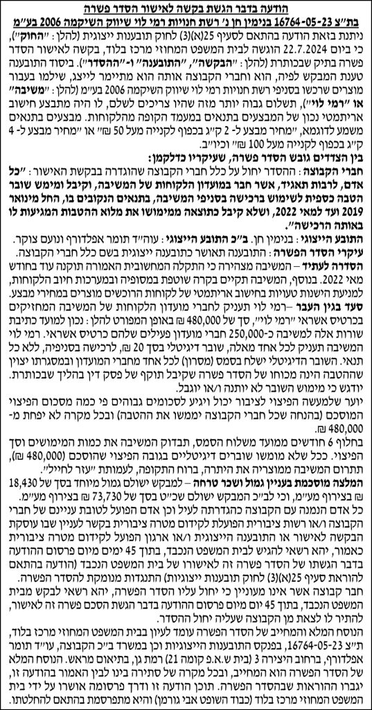 תקציר – ביום- 22.07.2024 בבית המשפט המחוזי בלוד אישור הסדר פשרה בין בנימין חן לבין רשת חנויות רמי לוי שיווק השיקמה 2006 בע"מ