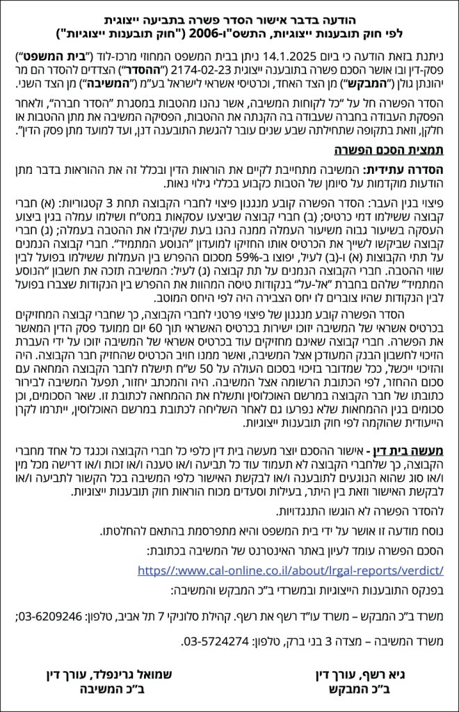 תקציר – ביום- 14.1.2025 בבית המשפט המחוזי מכרז-לוד אישור הסדר פשרה בין מר יהונתן גולן לבין כרטיסי אשראי לישראל בע"מ