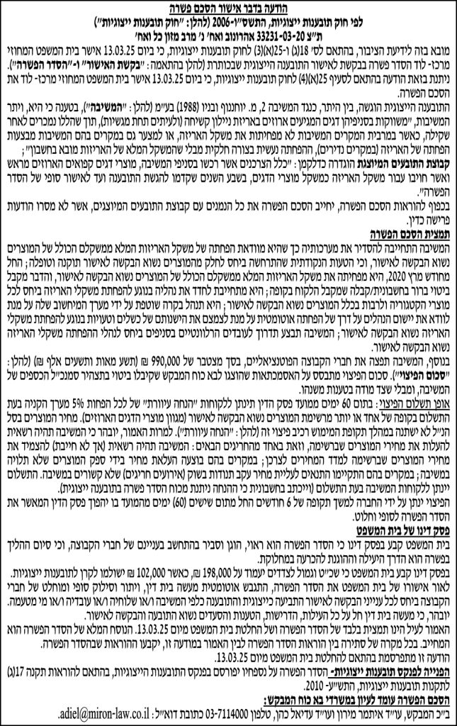 תקציר – ביום- 13.3.25 בבית המשפט המחוזי מרכז-לוד אישור הסדר פשרה בין אהרונוב ואח' לבין מרב מזון כל ואח'