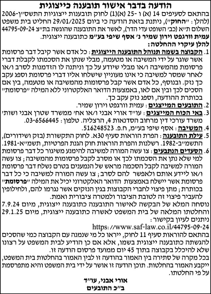 תקציר – ביום- 29.01.2025 בבית המשפט השלום בתל אביב אישור הסדר פשרה בין עמית וורגפט וירון שמיר לבין אסף שיפי בע"מ