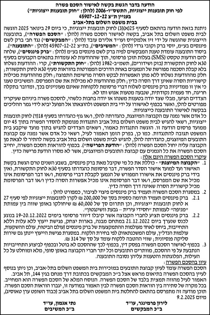 תקציר – ביום- 29.1.2025 בבית המשפט השלום בתל אביב אישור הסדר פשרה בין זיו אלמקייס ועו"ד אלירם עובד לבין חב' ברק לשם פיננסים בע"מ