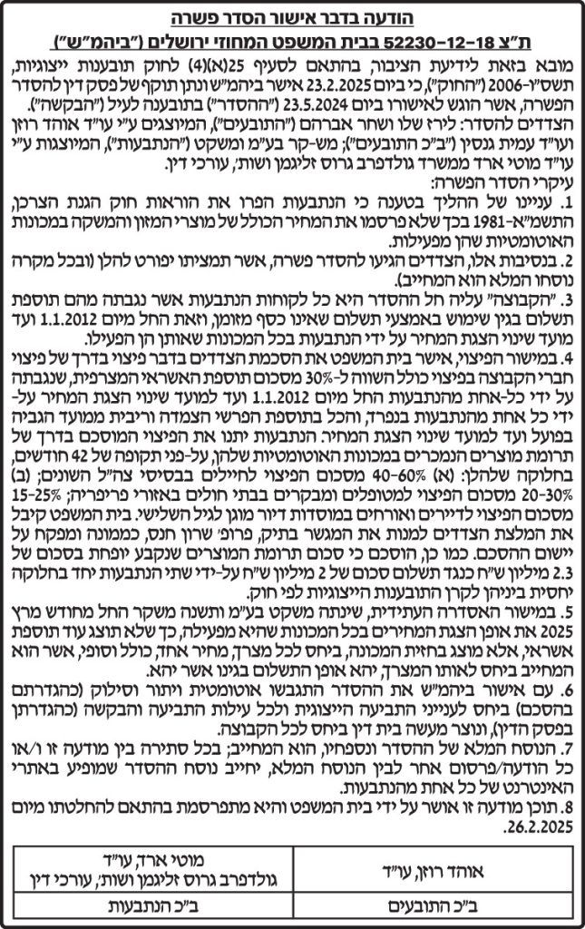 תקציר – ביום- 23.5.2024 בבית המשפט המחוזי ירושלים (ביהמ"ש) אישור הסדר פשרה בין לירז שלו ושחר אברהם לבין מש-קר בע"מ ומשקט