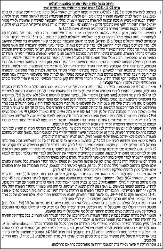 תקציר – ביום- 13.2.2025 בבית המשפט המחוזי בתל אביב אישור הסדר פשרה בין איפרח ואח' לבין רייסדור בנייה בע"מ ואח'