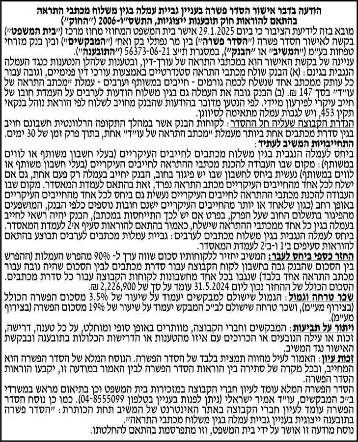 תקציר – ביום- 29.1.2025 בבית המשפט המחוזי מחוז מרכז אישור הסדר פשרה בין מר נפתלי בק ואח' לבין בנק מזרחי טפחות בע"מ