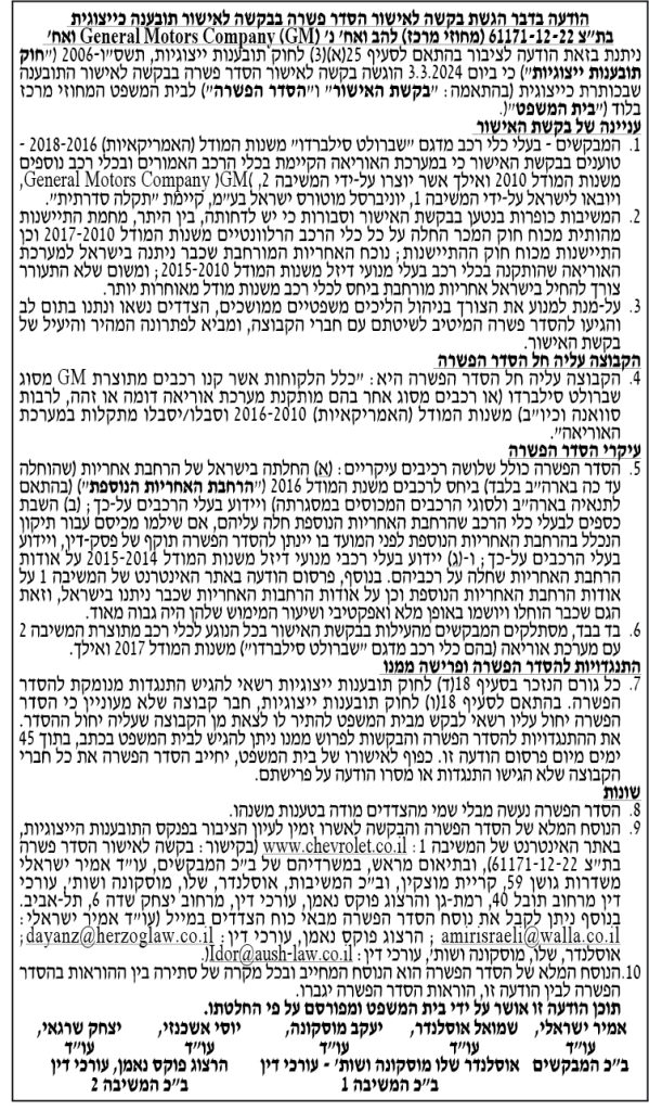 תקציר – ביום- 03.03.2024 בבית המשפט המחוזי בלוד אישור הסדר פשרה בין להב ואח' לבין General Motors Company ואח'