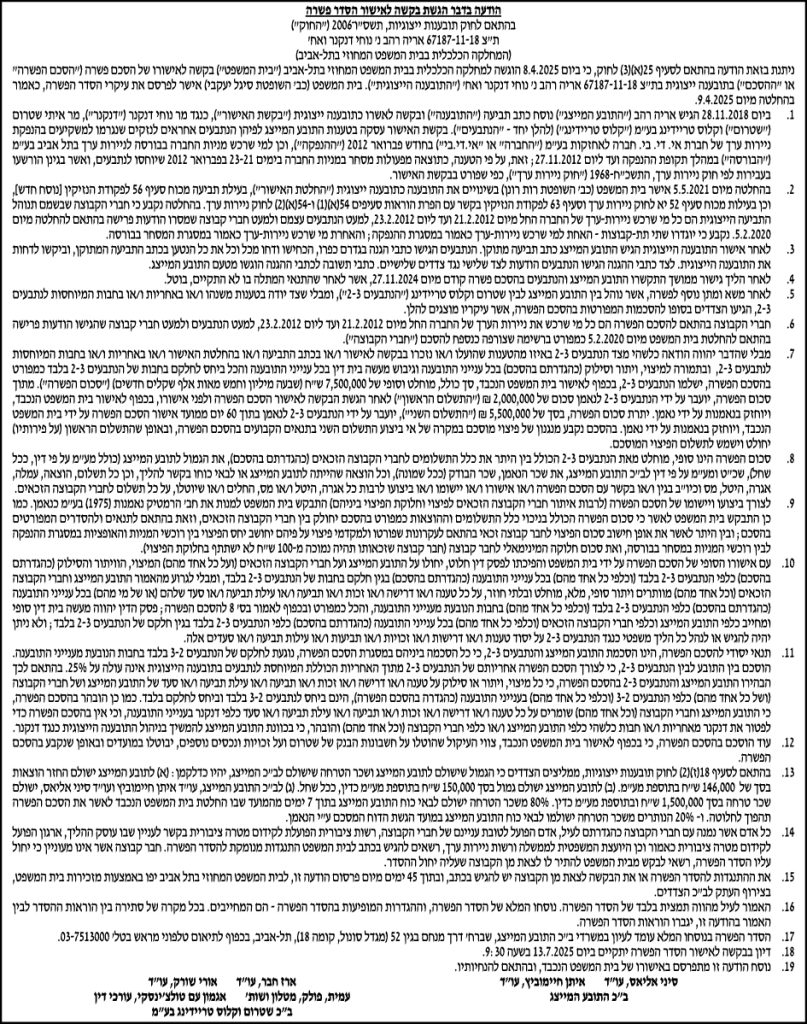תקציר – ביום- 8.4.2025 בבית המשפט המחוזי בתל-אביב אישור הסדר פשרה בין אריה רהב לבין נוחי דנקנר ואח'