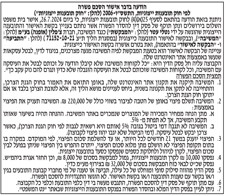 תקציר – ביום- 26.07.2024 בבית המשפט השלום בירושלים אישור הסדר פשרה בין נטלי עטר לבין חברת צ'פלין (אופנה) בע"מ