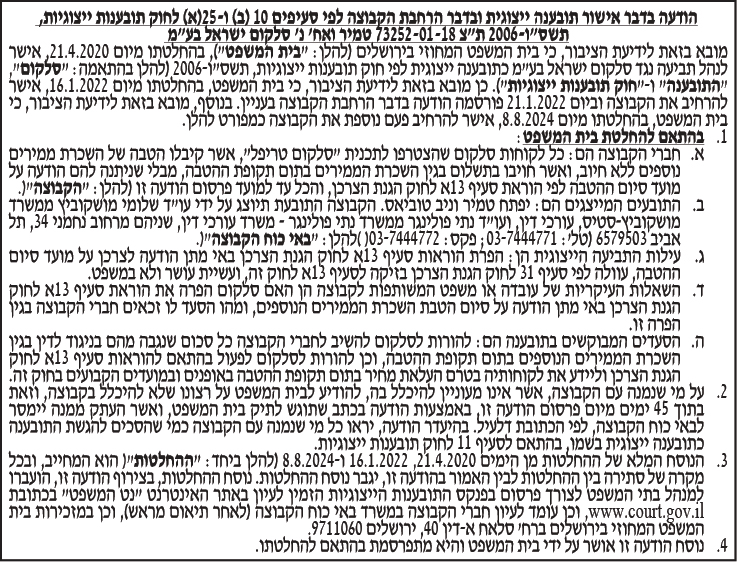תקציר – ביום- 08.08.2024 בבית המשפט המחוזי בירושלים אישור הסדר פשרה בין טמיר ואח' לבין סלקום ישראל בע"מ
