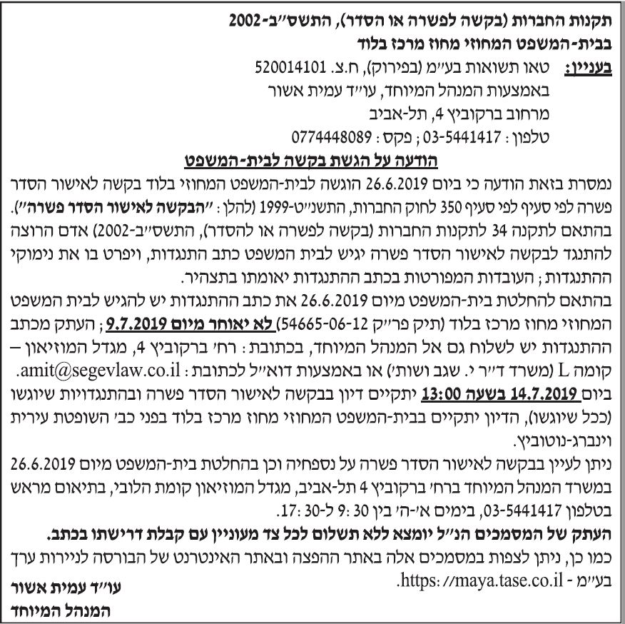 הודעה על הגשת בקשה לבית המשפט נמסרת בזאת הודעה כי ביום 26.6.2019 הוגשה לבית המשפט המחוזי בלוד בקשה לאישור הסדר פשרה לפי סעיף 350 לחוק החברות, התשנ"ט 1999. בהתאם לתקנה 34 לתקנות החברות, אדם הרוצה להתנגד לבקשה לאישור הסדר פשרה יגיש לבית המשפט כתב התנגדות, ויפרט בו את נימוקי ההתנגדות; העובדות המפורטות בכתב ההתנהגדות יאומתו […]
