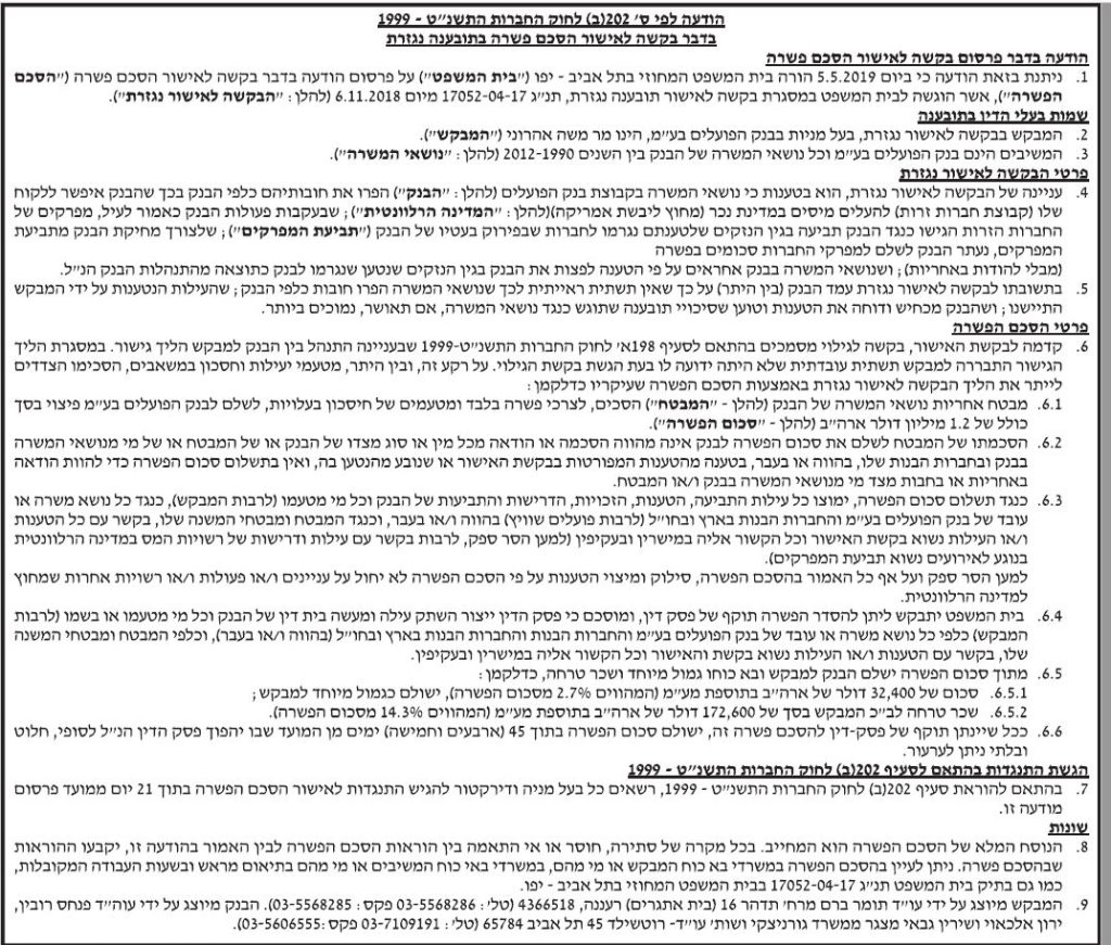 הסכם פשרה |בנק הפועלים בע"מ [17/05/2019]