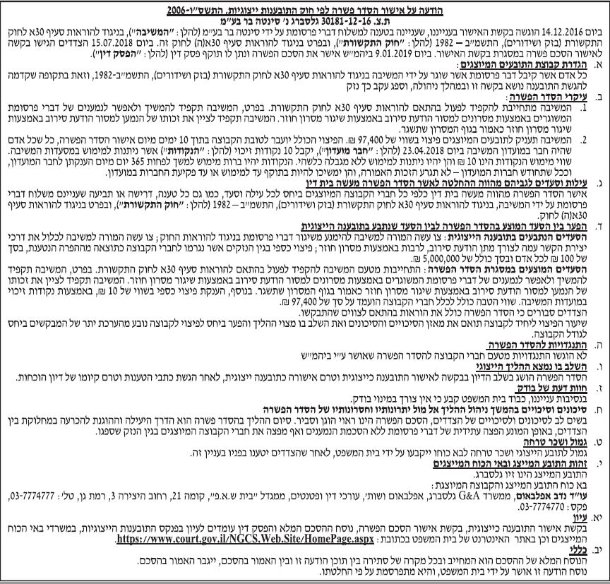 ת"צ – 30181-12-16 הצדדים – גלסברג נ' סינטה בר בע"מ תאריך פרסום – 24.1.2019 תקציר – נטען כי המשיבה שלחה דברי פרסומת בניגוד להוראות סעיף 30א לחוק התקשורת (בזק ושידורים), התשמ"ב – 1982, בפרט בניגוד להוראות סעיף 30א(ה) לחוק זה. ב"כ התובע המייצג – עו"ד נדב אפלבאום