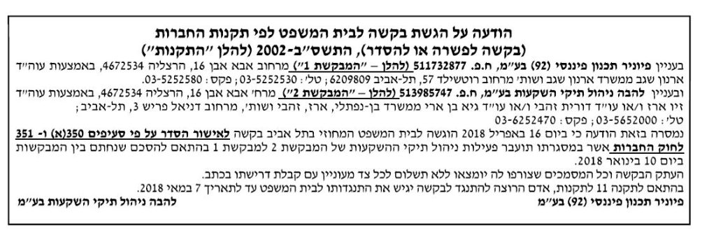 פיוניר תכנון פיננסי (92) בע"מ, ח.פ 511732877 (המבקשת 1) ובעניין להבה ניהול תיקי השקעות בע"מ ח.פ 513985747 (המבקשת 2) נמסרה הודעה כי ביום 16/4/18 הוגשה לבית המשפט המחוזי בתל אביב בקשה לאישור הסדר על פי סעיפים 350 (א) ו-351 לחוק החברות אשר במסגרתו תועבר פעילות ניהול תיקי ההשקעות של המבקשת 2 למבקשת 1 בהתאם להסכם […]