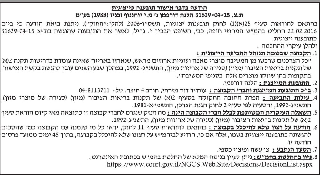 ת"צ: 31629-04-15 הצדדים: הלנה דורפמן נ' מ.י יוחננוף ובניו (1988) בע"מ תאריך פרסום: 14/03/17
