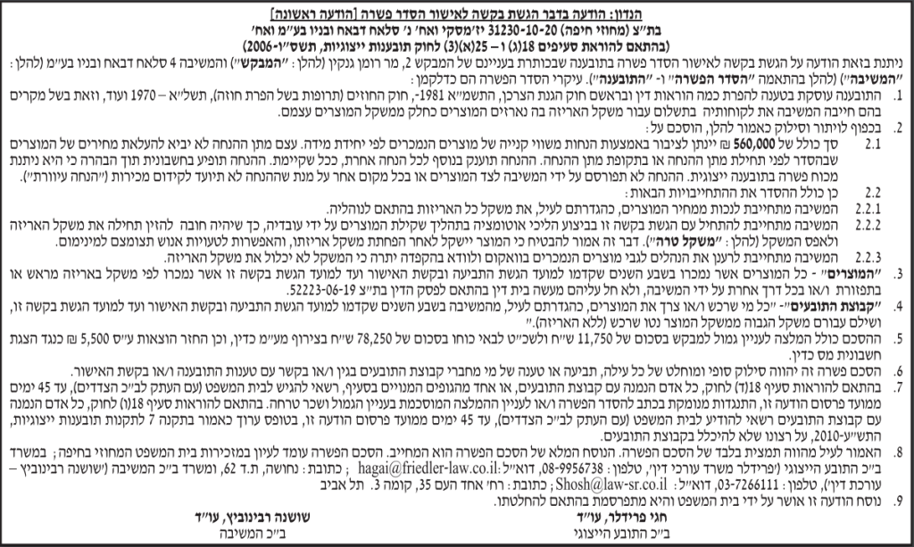 ת"צ– 13849-05-18 הצדדים – אשכנזי נ' שחק א.ב. מוסכים בע"מ תאריך פרסום- 04.03.21 תקציר – טענה כי המשיבה שלחה מסרים פרסומיים שלפי הנטען היו שלא כדין ב"כ המבקש – עו"ד נדב אפלבאום ב"כ המשיבה – עו"ד רונן מנור המודעה פורסמה בעיתון מעריב ובעיתון גלובס נשמח לפרסם לכם מודעת תובענה ייצוגית/ הסדר פשרה בעיתון