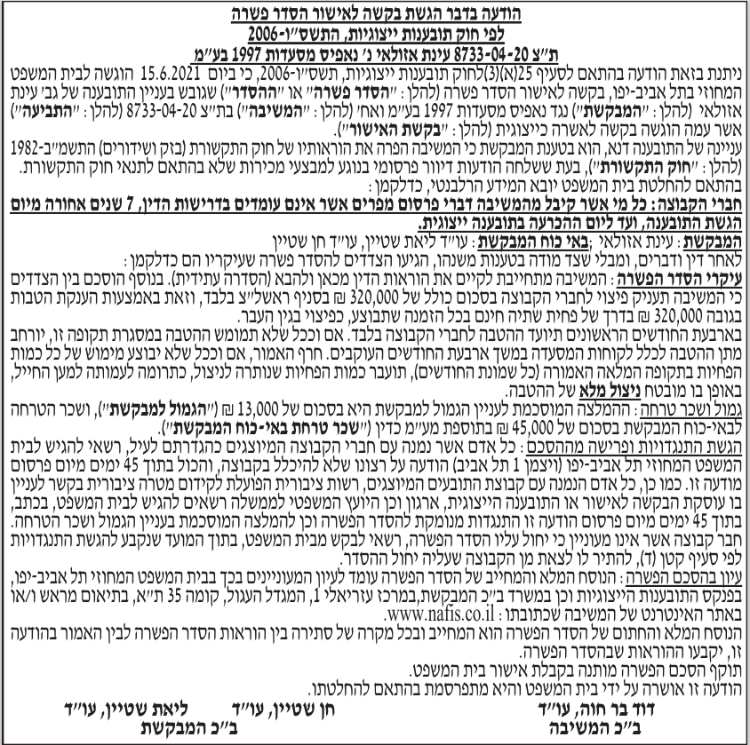 ת"צ – 8733-04-20 הצדדים – עינת אזולאי נ' נאפיס מסעדות 1997 בע"מ תאריך פרסום – 24.06.2021 תקציר – בטענה כי המשיבה הפרה את הוראות חוק התקשורת בכך ששלחה הודעות דיוור פרסומי בנוגע למבצעי מכירות, ללא אישור הלקוחות. ב"כ המבקשת – חן שטיין, עו"ד ליאת שטיין, עו"ד ב"כ המשיבה – דוד בר חוה, עו"ד המודעה פורסמה בעיתון ידיעות אחרונות ובעיתון […]