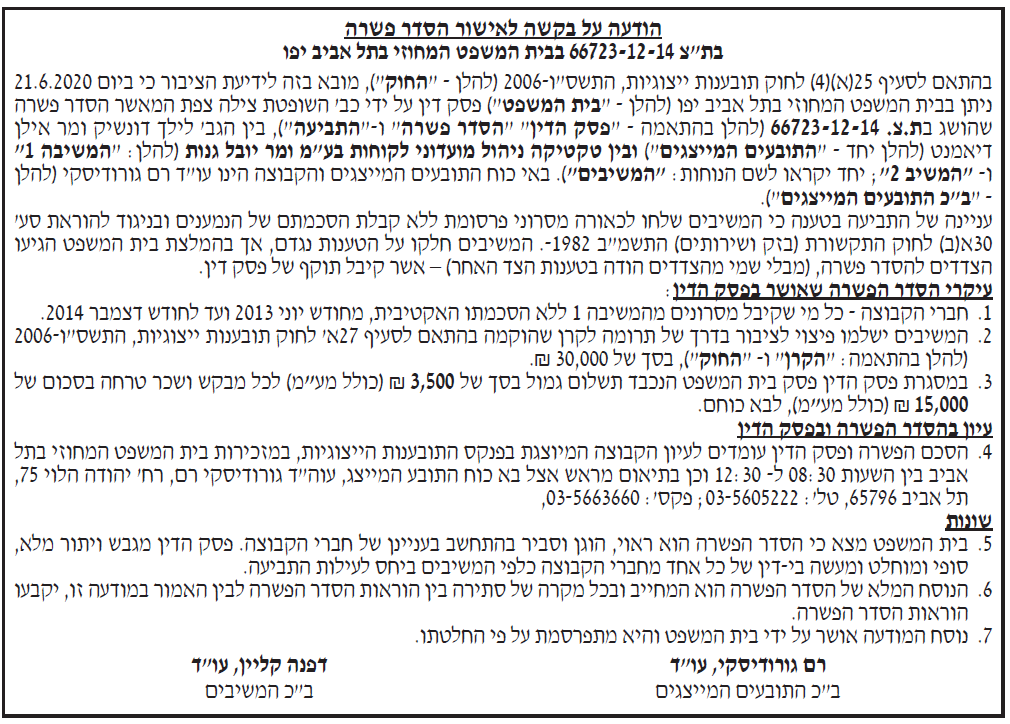 ת"צ 47661-11-18 הצדדים – לילך דונשיק נ' טקטיקה ניהול מועדוני לקוחות בע"מ ויובל גנות תאריך פרסום: 12/07/2020 תקציר – הטענה כי המשיבים שלחו מסרוני פרסומת ללא קבלת הסכמתם של המבקשים תוך הפרה על חוק התקשורת. ב"כ המבקש- עו"ד רם גורודיסקי ב"כ המשיבה-עו'"ד דפנה קליין המודעה פורסמה בעיתון מעריב הבוקר ובעיתון ישראל היום נשמח לפרסם לכם מודעת תובענה ייצוגית/ הסדר פשרה בעיתון