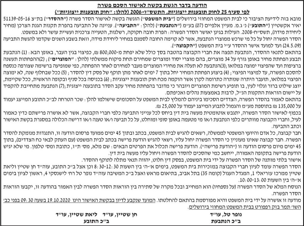 ת"צ 51139-05-16 הצדדים – יאיר אקשטיין נ' ג.מ. מעיין אלפיים בע"מ תאריך פרסום: 01/06/2020 תקציר – טענות התביעה בהפרת תקנות הגנת הצרכן, הפרצ חובה חקוקה, רשלנות, הטעיה צרכנית, עשייה עושר ולא במשפט ב"כ המבקשים: עו"ד נופר טל ב"כ המשיבה: עו"ד חן שטיין, עו"ד ליאת שטיין המודעה פורסמה בעיתון הארץ ובעיתון גלובס נשמח לפרסם לכם מודעת […]