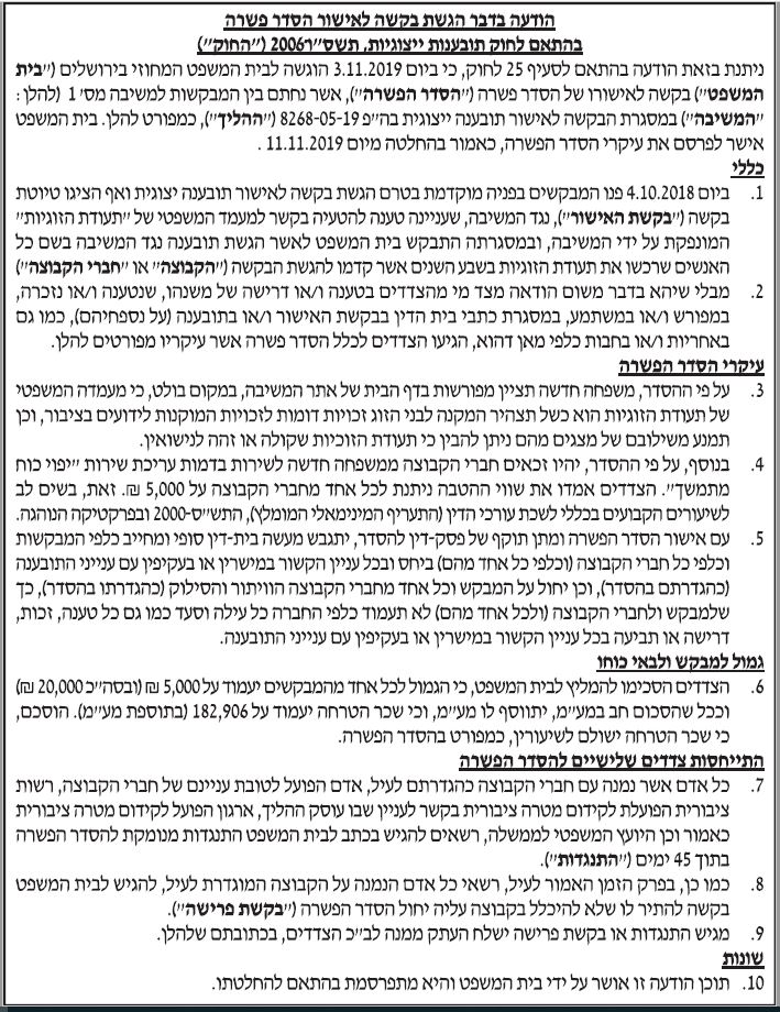 ת"צ – 8268-05-19 הצדדים – שחר קורן ואח' נ' משפחה חדשה תאריך פרסום – 21/11/19 תקציר – עניינה של התביעה היא בטענת התובעים להטעיה בקשר למעמד המשפטי של "תעודת הזוגיות" המונפקת על ידי המשיבה, ובמסגרתה התבקש בית המשפט לאשר הגשת תובענה נגד המשיבה בשם כל האנשים שרכשו את תעודת הזוגיות בשבע השנים אשר קדמו להגשת הבקשה. […]