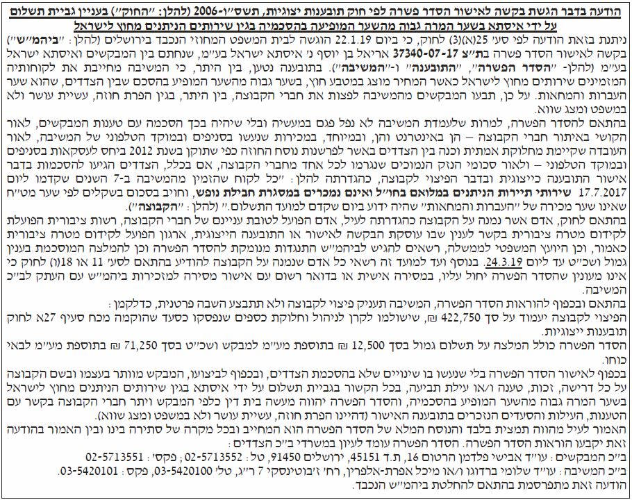 הסדר פשרה |איסתא ישראל בע"מ [07/02/2019]
