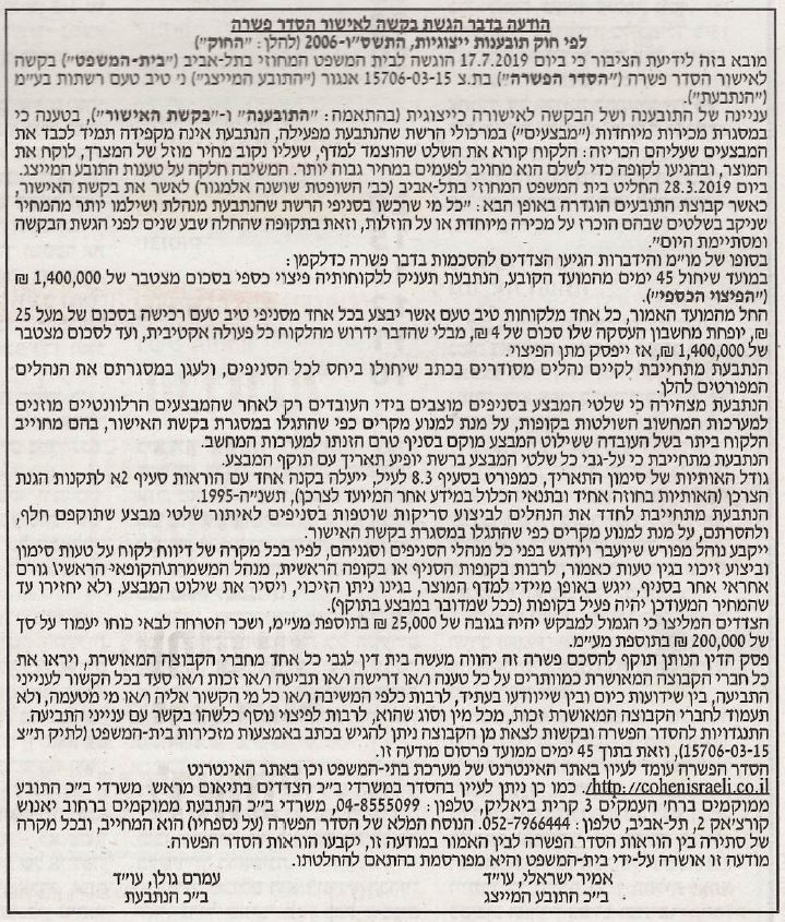 ת"צ – 42546-02-18 הצדדים – דרין נ' ביי מי טכנולוגיות בע"מ תאריך פרסום – 28/10/2019 תקציר – טענת התובעת כי חלק משוברי המתנה שביי מי משווקת כוללים תנאים מגבילים וכי על חלק מתווי הקניה שמשווקת ביי מי קיימים קיימים תנאים מגבילים שלא מפורטים על גבי תווי הקניה. ב"כ המבקש: עו"ד ניצן רובינשטיין, עו"ד אבישי פלדמן […]