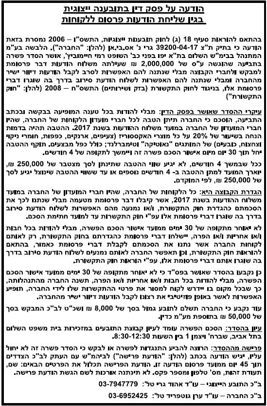 ת"צ – 39200-04-17 הצדדים – גרי נ' אס.בי.אן בע"מ תאריך פרסום – 7.2.2019 תקציר – עילת התביעה היא משלוח הודעות דבר פרסומת למבקש ולחברי הקבוצה מבלי שניתנה להם האפשרות לשלוח הודעת סירוב בדרך בה שוגרו דברי פרסומת אלו, בניגוד לחוק התקשורת (בזק ושירותים) התשס"ח – 2008. ב"כ התובע – עו"ד אהוד גרי ב"כ הנתבעת – […]