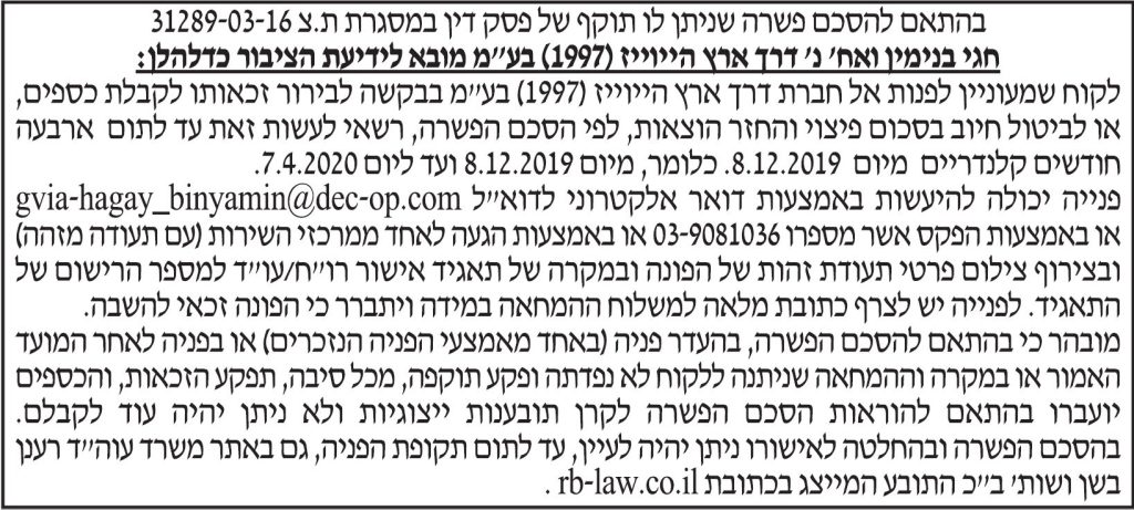 ת"צ – 31289-03-16 הצדדים – חגי בנימין ואח' נ' דרך ארץ הייוייז (1997) בע"מ תאריך פרסום – 10/12/19 תקציר – לקוח שמעוניין לפנות אל חברת דרך ארץ לבירור זכאות לקבל כספים, או לביטול חיוב בסכום פיצוי והחזר הוצאות, לפי הסכם הפשרה, רשאי לעשות זאת עד לתום ארבעה חודשים קלנדריים מיום 8.12.2019. בהסכם הפשרה ובהחלטה לאישורו ניתן […]